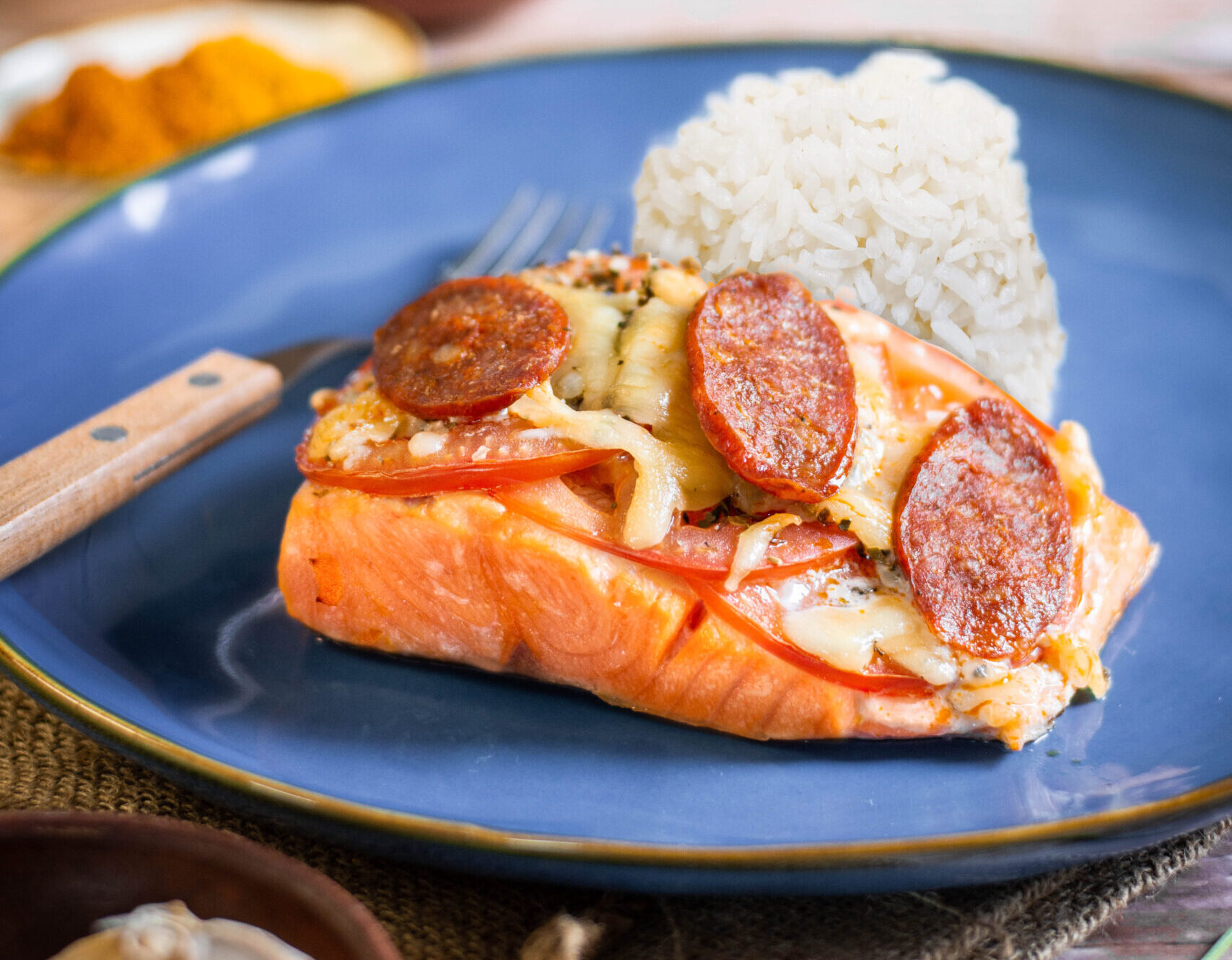 Disponer sobre el salmón el tomate y espolvorear el orégano, el queso y finalmente las rodajas de longaniza.