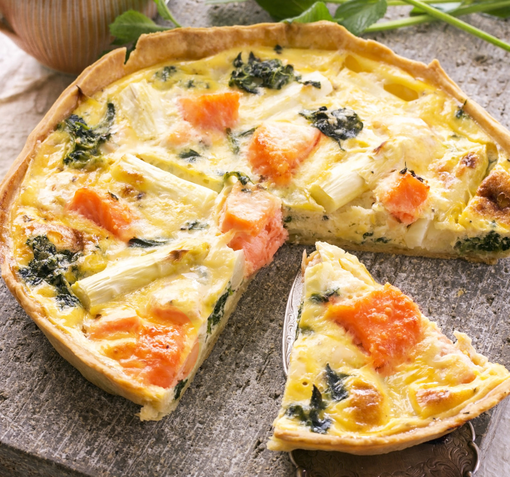 Mezclar el salmón, los espárragos y la salsa blanca. Verter la mezcla en la masa, y hornear hasta que quede dorado en la superficie.